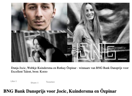 Dunja Jocic, Wubkje Kuindersma en Rutkay Özpinar zijn de winnaars van de derde BNG Bank Dansprijs voor Excellent Talent. De jonge makers ontving 24 mei gezamenlijk een prijs van vijftigduizend euro waarmee een triple-bill van hun werk wordt samengesteld die dit najaar op tournee gaat langs … Read more